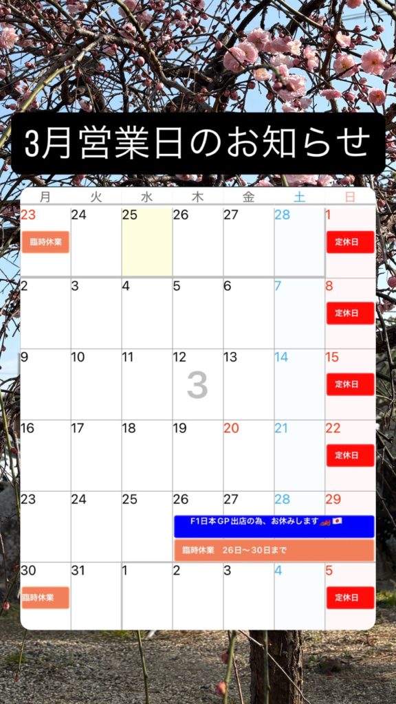 月末は春開催となったF1日本グランプリへの出店があるので、白子のお店の方はお休みさせていただきます。毎年のことながらご了承の程お願いいたします。(20日は祝日ですが営業します)